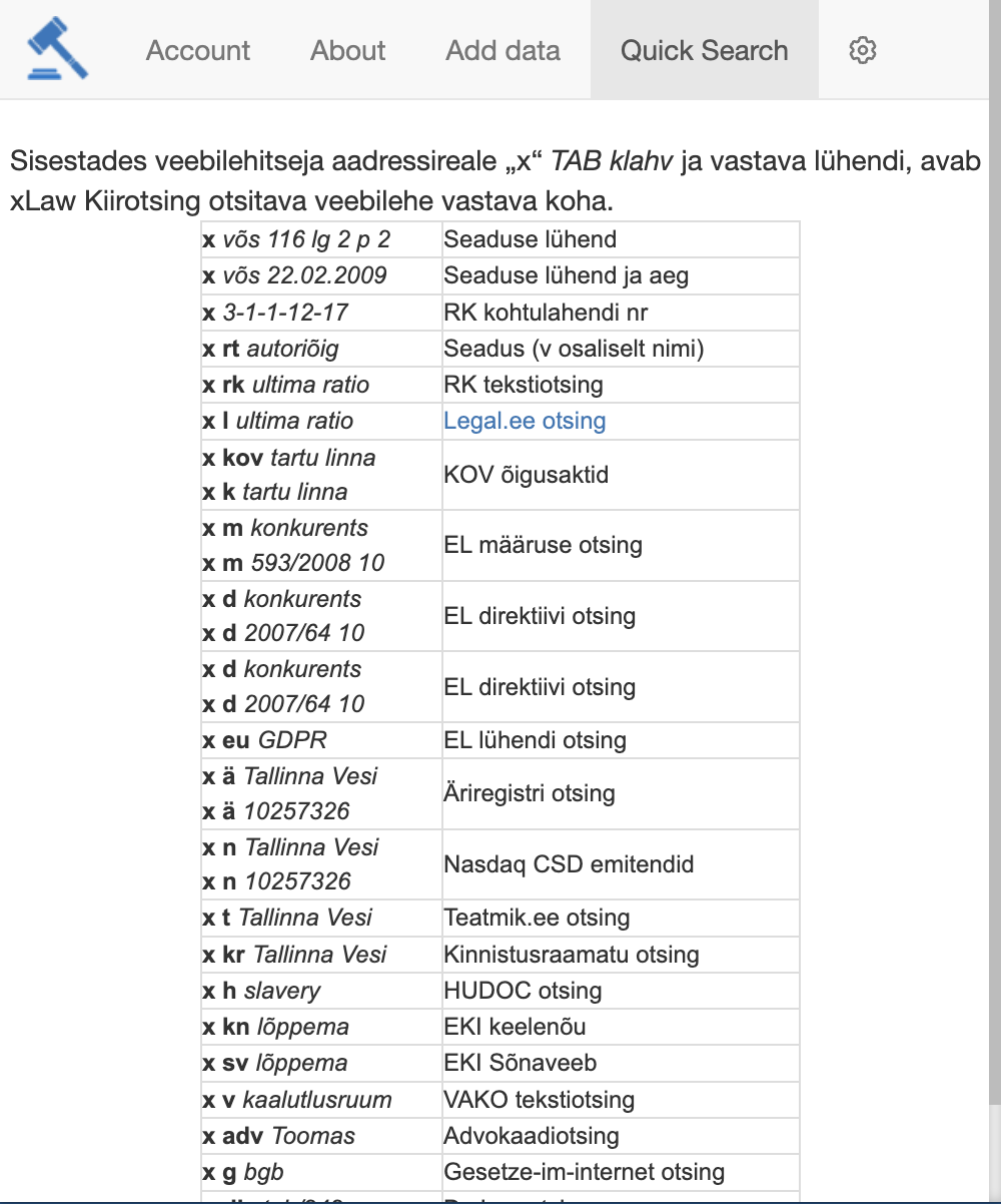 Kiirotsingu lühendid on kättesaadavad xLaw rakenduses (ekraani üleval paremal nurgas haamrile klikkides).