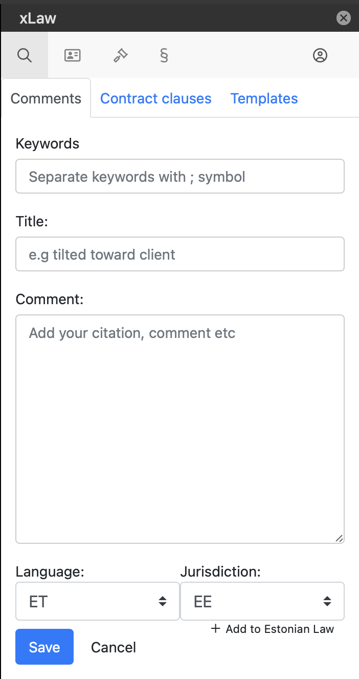 Section titled “Kommentaaride lisamine ja nende märksõnastamine”Lisa kommentaaridele Eesti seaduse § ning kommentaar ilmub ka xLaw RT seaduse § juurde xLaw RT Kasutaja privaatsete kommentaaride juurde. Kommentaari dokumendist märksõnastikku kandmine - „Add comments” (teksti aktiveerides siniseks).